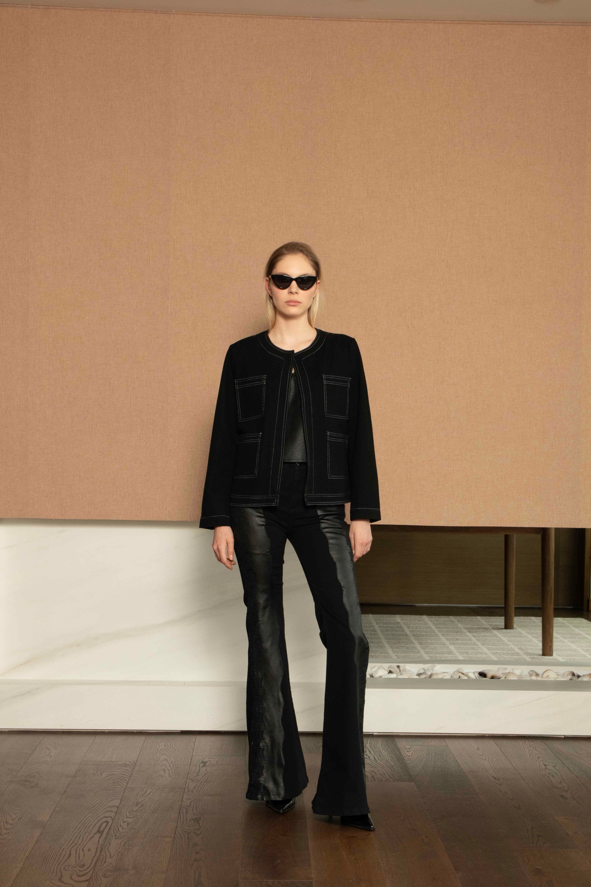 ThisJacket is made of denim and 63% polyester, 37% acetate.